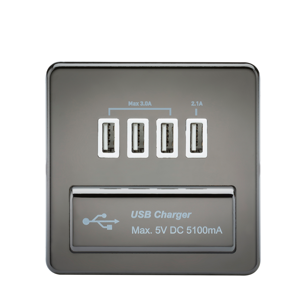 The Knightsbridge SFQUADBN / SFQUADBNW1G Black Nickel Screwless Quad USB Outlet is ideal for use in the modern home, businesses and hotels. The screwless design features an easy clip-on cover with an internal gasket for moisture protection and matching screws. It has an ultra-slim profile and is constructed from durable, and high-temperature resistant thermoset plastic.