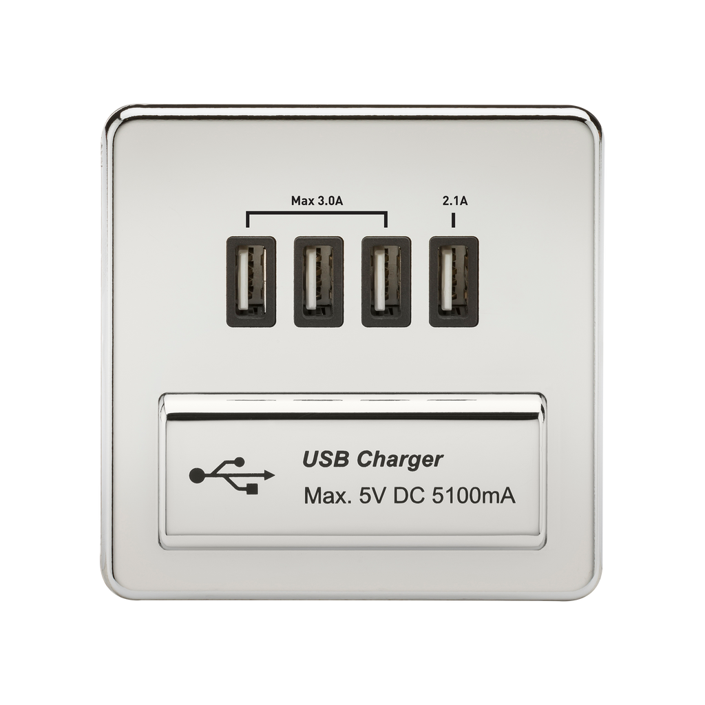 The Knightsbridge SFQUADPC Polished Chrome Screwless Quad USB Outlet is ideal for use in the modern home, businesses and hotels. The screwless design features an easy clip-on cover with an internal gasket for moisture protection and matching screws. It has an ultra-slim profile and is constructed from durable, and high-temperature resistant thermoset plastic.