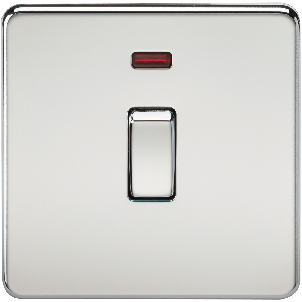 The Knightsbridge 20 Amp 1G DP Screwless Polished Chrome Switch with Neon is the ideal decorative upgrade for use in the modern home, businesses and hotels. The screwless design features an easy clip on cover with an internal gasket for moisture protection and matching screws. It has an ultra slim profile and is constructed from durable and high temperature resistant thermoset plastic.