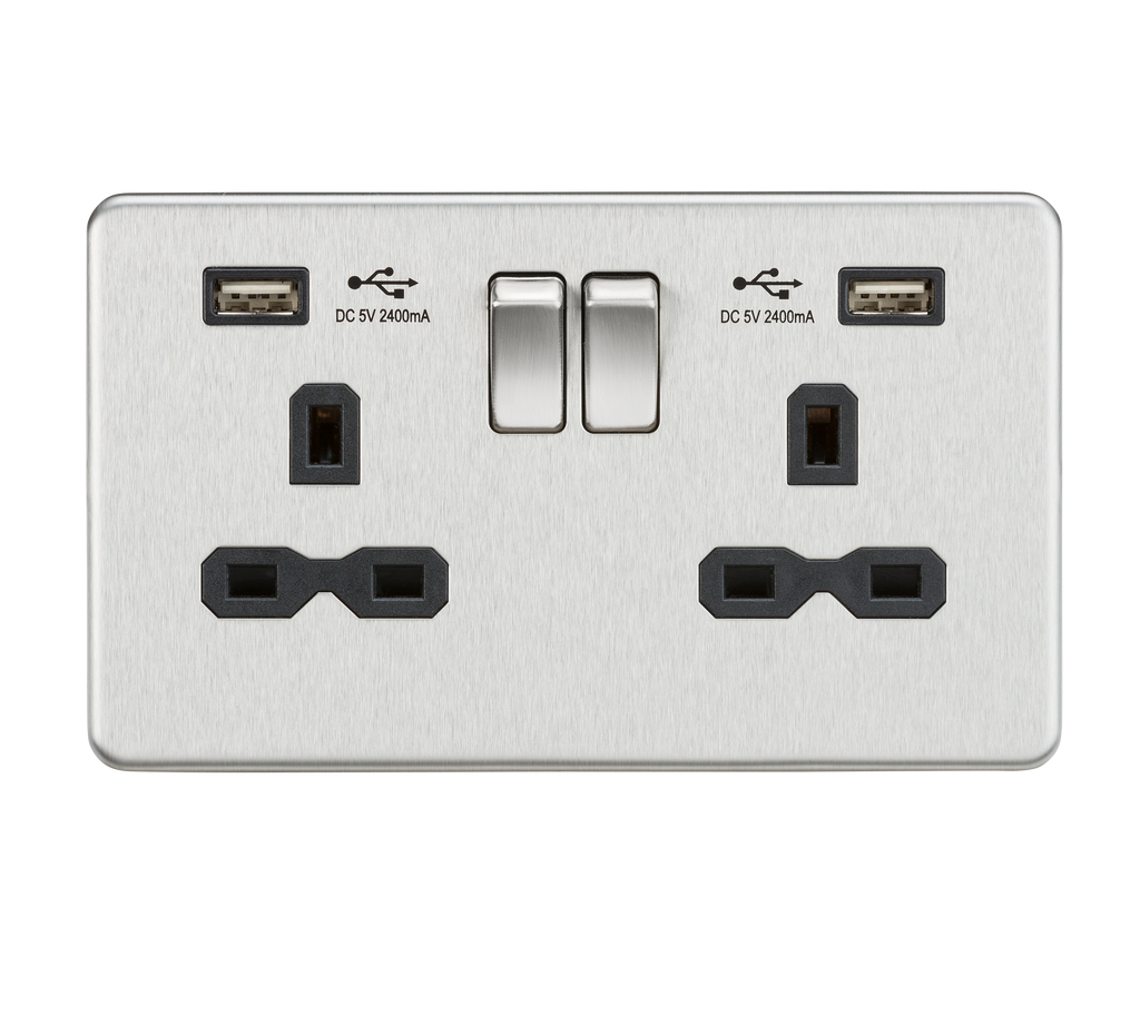 The Knightsbridge SF9902BC / SF9902BCW 13A 2G Brushed Chrome Switched Socket with Dual USB is ideal for use in the modern home, businesses and hotels. The screwless design features an easy clip on cover with an internal gasket for moisture protection and matching screws. It has an ultra slim profile and is constructed from durable, and high-temperature resistant thermoset plastic.
