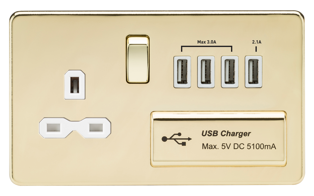 2G 13A Screwless Polished Brass 1G Switched Socket with Quad 5V USB Charger Ports - White Insert