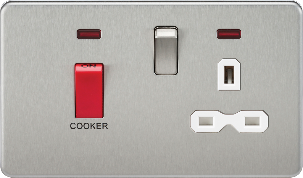 The Knightsbridge 45 Amp 2G Double Pole Screwless Cooker Control Unit in Brushed Chrome enables isolation of the unit so maintenance and cleaning can be safely carried out. The screwless design features an easy clip-on decorative metal cover with an internal gasket for moisture protection and matching screws.