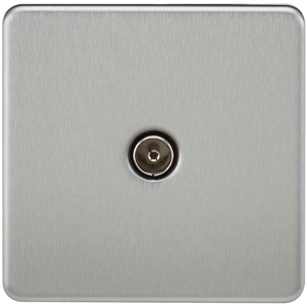 The Knightsbridge Screwless Coaxial TV Outlet Un-isolated Single Plate in Brushed Chrome is the ideal decorative upgrade for use in the modern home, businesses and hotels. The screwless design features an easy clip on cover with an internal gasket for moisture protection and matching screws. It has an ultra slim profile and is constructed from durable and scratch resistant thermoset plastic material.
