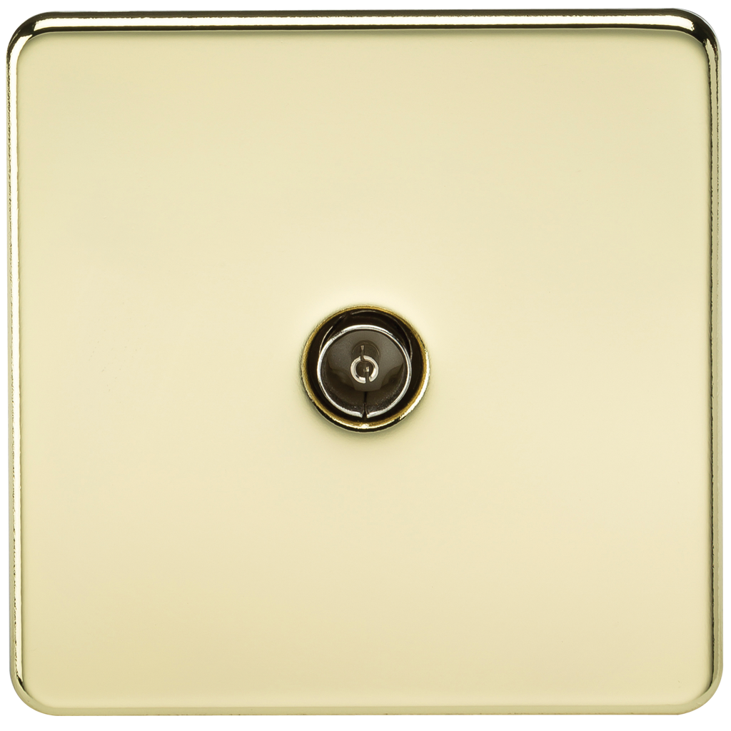 The Knightsbridge Screwless Coaxial TV Outlet Un-isolated Single Plate in Polished Brass is the ideal decorative upgrade for use in the modern home, businesses and hotels. The screwless design features an easy clip on cover with an internal gasket for moisture protection and matching screws. It has an ultra slim profile and is constructed from durable and scratch resistant thermoset plastic material.