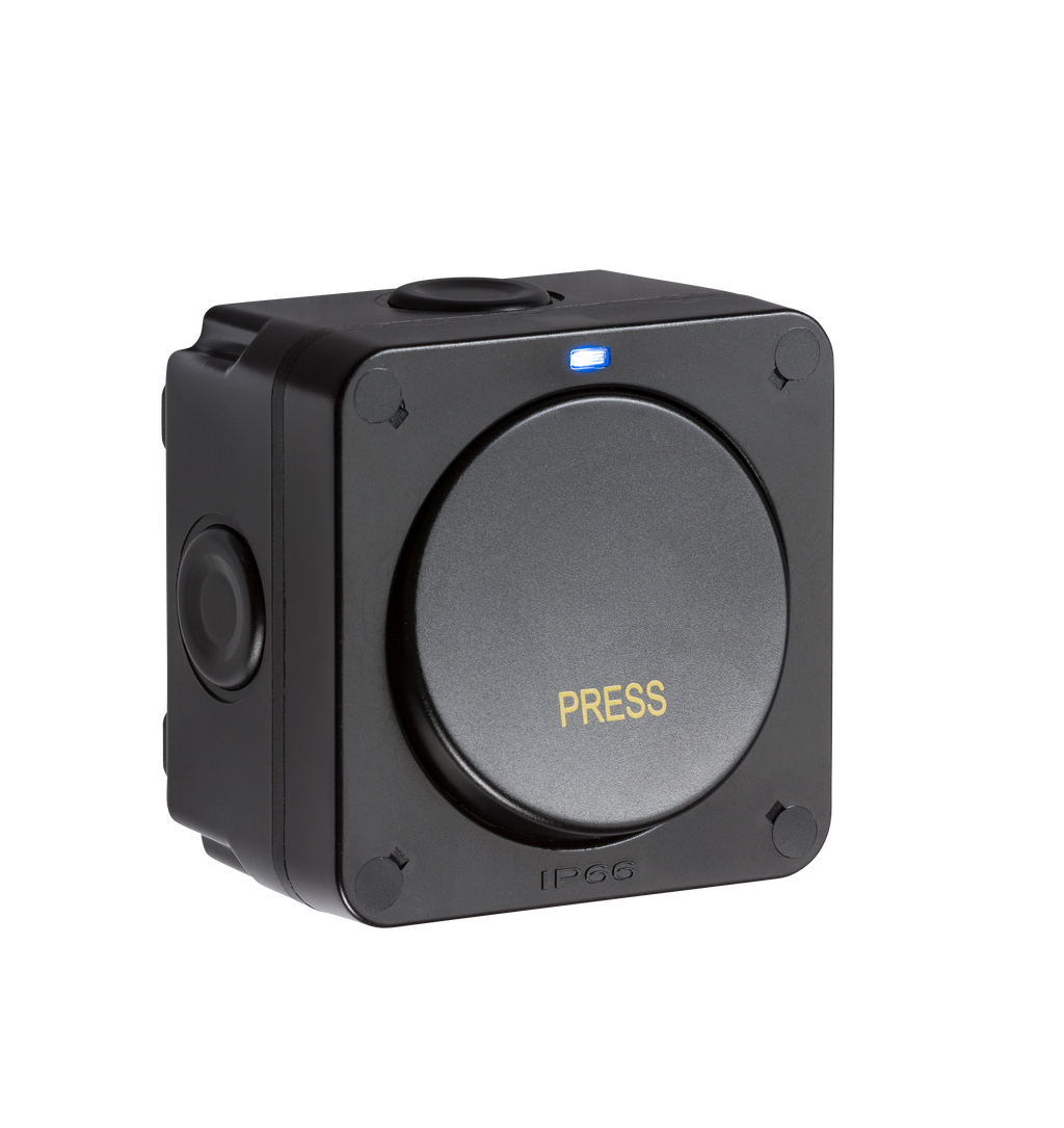 Outdoor switch with blue LED activity/location feature. Black finished with a unique circular rocker switch printed "PRESS". Multiple 20mm cable entries/exits allow for optimum positioning.