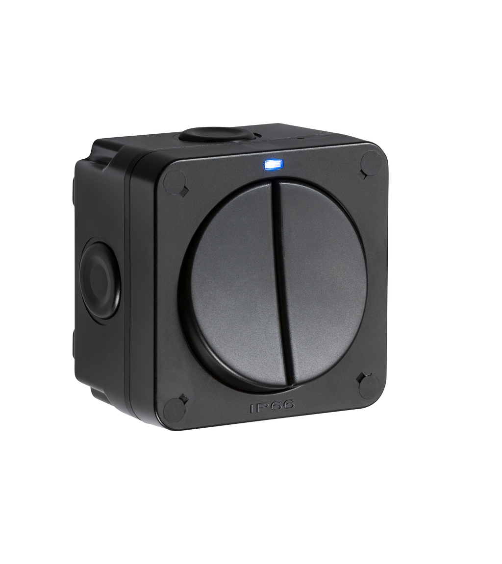Outdoor switch with blue LED activity/location feature. Black finished with a unique circular rocker switch. Multiple 20mm cable entries/exits allow for optimum positioning.