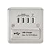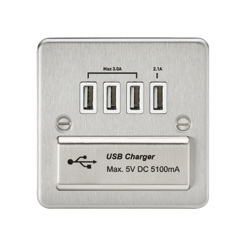 Ideal solution for multiple users, dedicated Quad USB charger. Flat Plate low profile metal design with matching metal rockers. Perfect for Coffee shops. foyers, receptions, hotel rooms etc.
