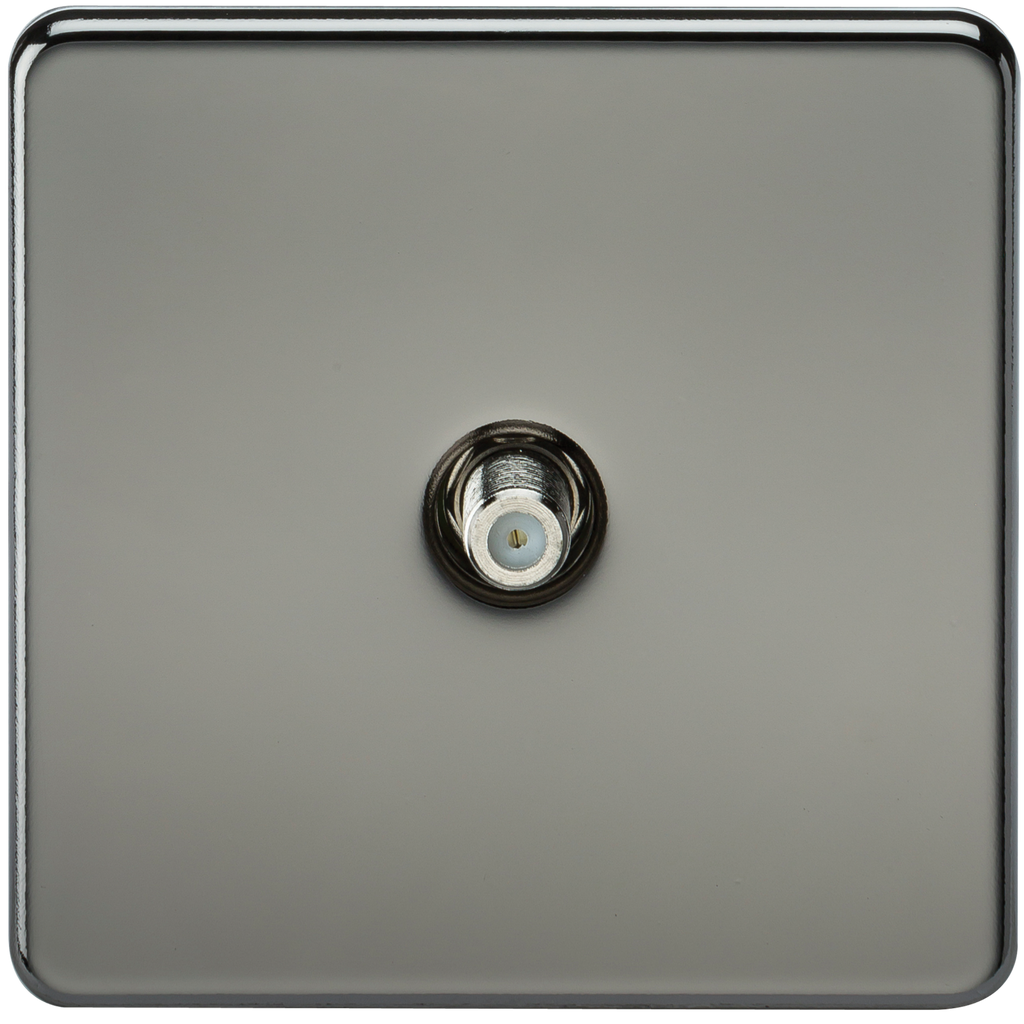 The Knightsbridge Screwless Satellite F-type TV Outlet in Black Nickel is a non-isolated decorative single wall plate ideal for the modern home. The screwless design features an easy clip on cover with an internal gasket for moisture protection and matching screws.