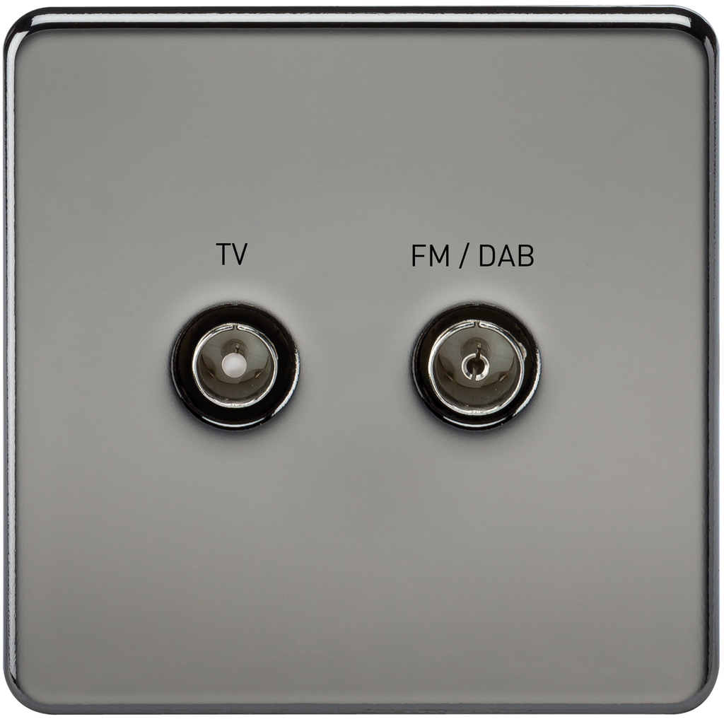 The Knightsbridge Screwless Screened Diplex TV and FM DAB Outlet is a decorative Black Nickel single wall plate ideal for the modern home.The screened diplexer enables the signal from one coaxial cable to be used for both Digital TV reception and FM DAB reception.