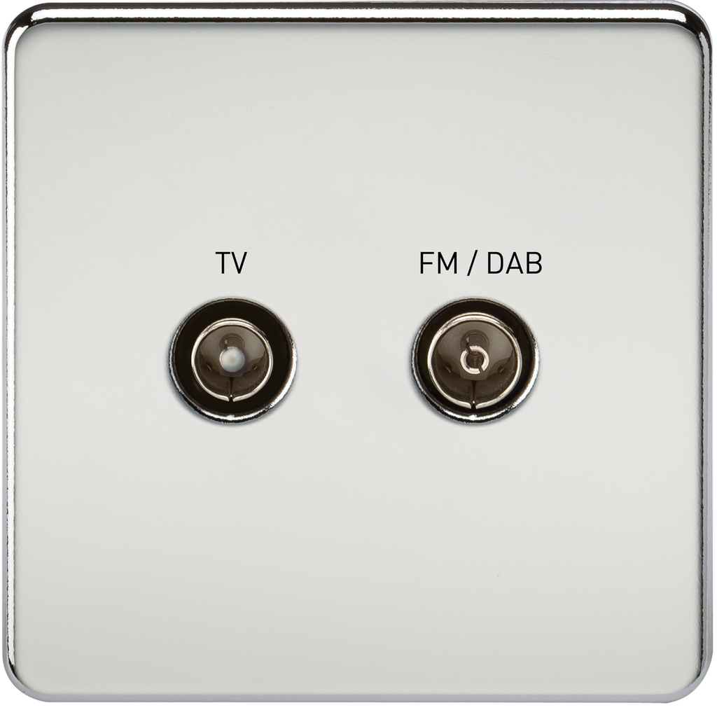 The Knightsbridge Screwless Screened Diplex TV and FM DAB Outlet is a decorative Polished Chrome single wall plate ideal for the modern home. The screened diplexer enables the signal from one coaxial cable to be used for both Digital TV reception and FM DAB reception.