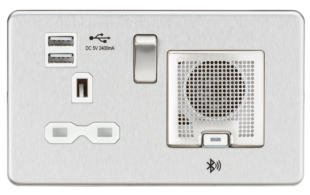 Screwless 13A socket, USB chargers (2.4A) and Bluetooth Speaker - Brushed chrome