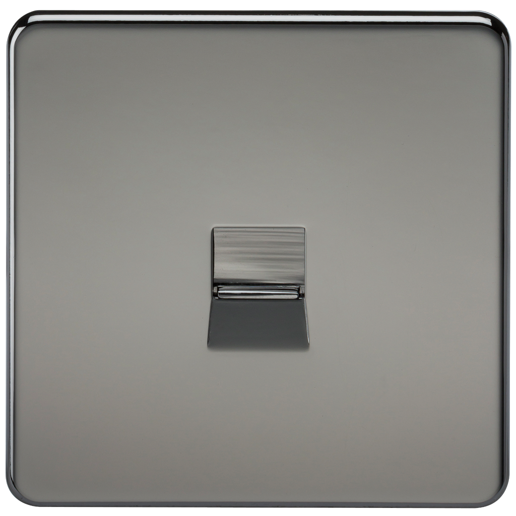 The Knightsbridge SF7300BN Screwless Telephone Master Socket in Black Nickel is a decorative single wall plate, ideal for the modern home. The decorative plate features an easy clip on cover with internal gasket for moisture protection and matching screws. It has an ultra slim profile and is made from high quality ultra slim, premium grade material and complete with integral gasket.