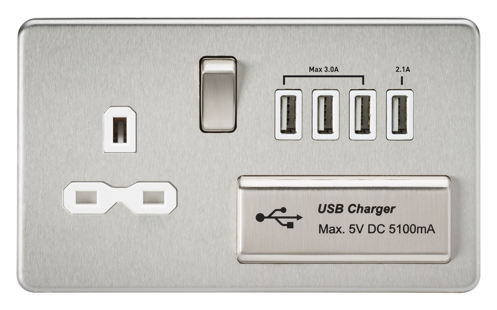 Ideal solution for multiple users, combining a 13A switched socket with a Quad USB charger. Screwless low profile metal design with matching metal rockers. Perfect for Coffee shops. foyers, receptions, hotel rooms etc. - 13A Switched socket - Quad USB Charging 5V DC5.1A (shared) - Dedicated 2.1A outlet for tablets - 3 outlets sharing 3A for multiple smart phones and other devices - Screwless low profile design with built in gasket - Certified to BS1363-2 - EMC Certified and ErP Ready - Minimum mounting box depth 25-35mm* *dependent on wiring conditions WE RECOMMEND YOU ALWAYS USE CERTIFIED USB CABLES FOR SAFETY AND TO ENSURE COMPATIBILITY