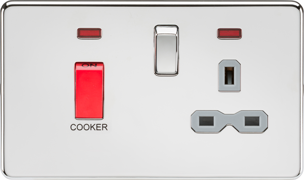Cooker control units enable isolation of the unit so that maintenance and repairs to be carried out separately. The unit can be switched off, preventing the appliance from being turned on accidentally - for example whilst cleaning. Control two or more cooking appliances in the same room, providing rating is sufficient. This model combines a 45A switch with a 13A socket. Flawless Screwless design. - 45A - Double pole - With neon indicators - 13A switched socket - Screwless low profile design with built in gasket - Certified to BS 4177, BS 1363-2 - Minimum mounting box depth: 47mm