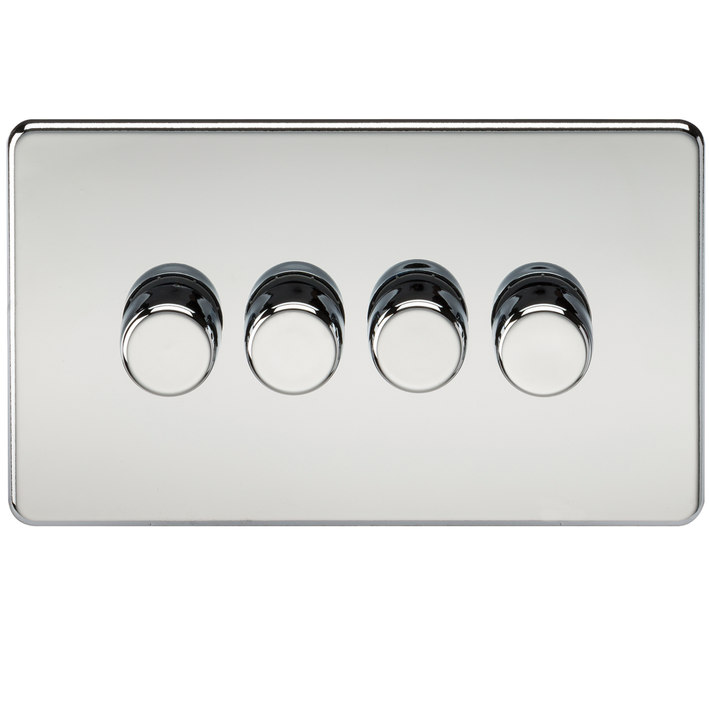 The Knightsbridge 4G 2 Way Dimmer Switches in Polished Chrome is the ideal decorative upgrade for use in the modern home, businesses and hotels. The screwless design features an easy clip-on cover with an internal gasket for moisture protection and matching screws. It has an ultra-slim profile and is constructed from durable, and high-temperature resistant thermoset plastic.