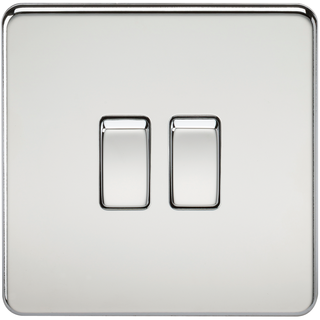 The Knightsbridge 10 Amp 2G 2 way Screwless Polished Chrome Switch is the ideal decorative upgrade for use in the modern home, businesses and hotels. The screwless design features an easy clip on cover with an internal gasket for moisture protection and matching screws. It has an ultra slim profile and is constructed from durable, and high temperature resistant thermoset plastic.
