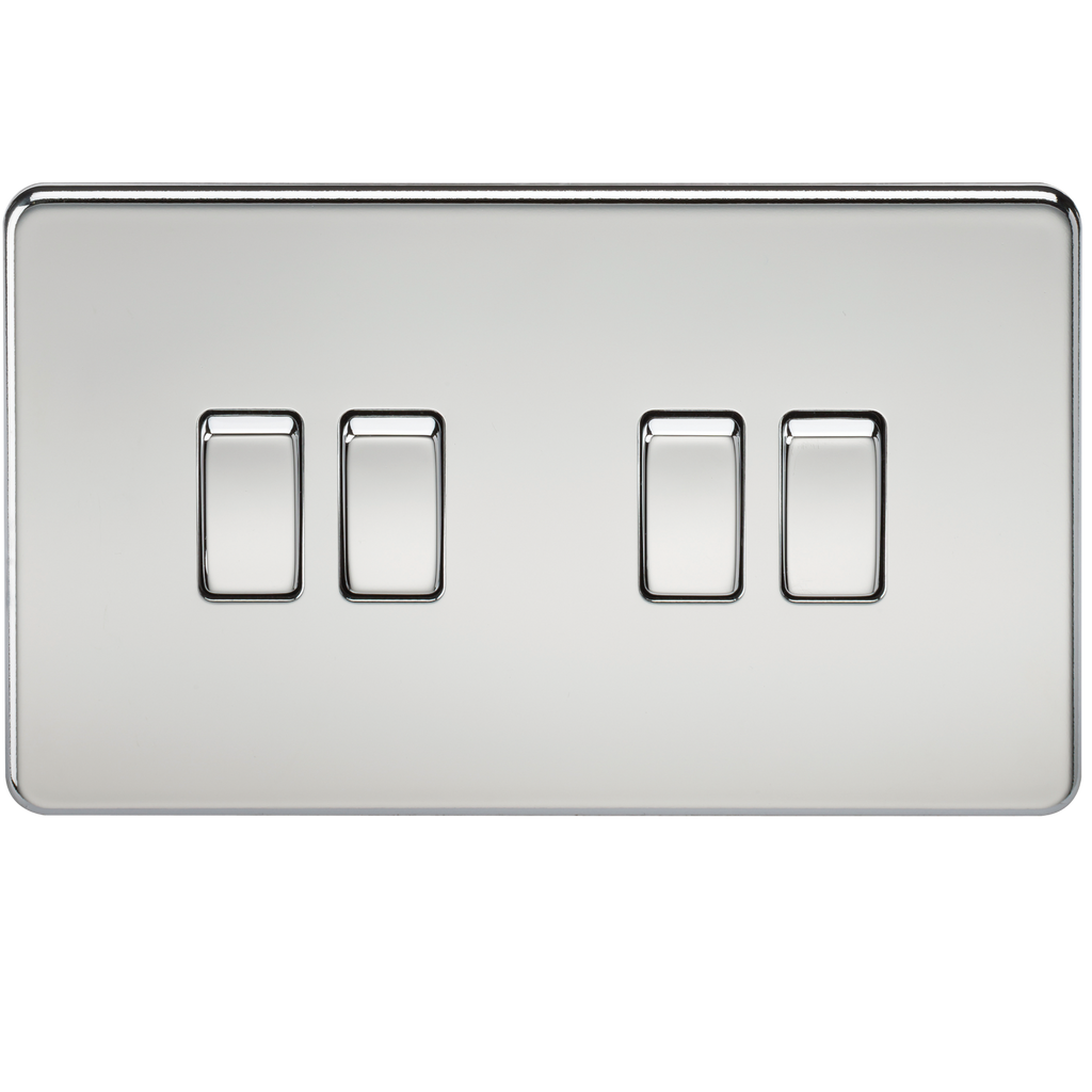 The Knightsbridge 10 Amp 4G 2 way Screwless Polished Chrome Switch is the ideal decorative upgrade for use in the modern home, businesses and hotels. The screwless design features an easy clip on cover with an internal gasket for moisture protection and matching screws. It has an ultra slim profile and is constructed from durable, and high temperature resistant thermoset plastic.