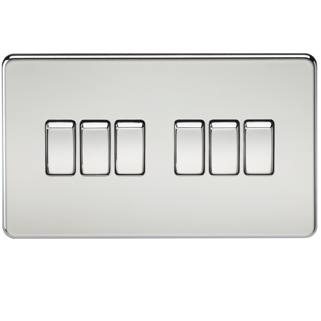 The Knightsbridge 10 Amp 6G 2 way Screwless Polished Chrome Switch is the ideal decorative upgrade for use in the modern home, businesses and hotels. The screwless design features an easy clip on cover with an internal gasket for moisture protection and matching screws. It has an ultra slim profile and is constructed from durable, and high temperature resistant thermoset plastic.