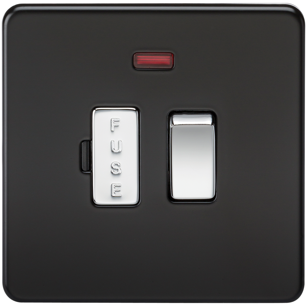 The Knightsbridge SF6300NMB Screwless switched fused spur unit or fused connection unit with neon in Black Nickel with chrome rocker. An electrical switch with a built in 13 amp fuse designed for appliances that do not have or require a fused plug top.