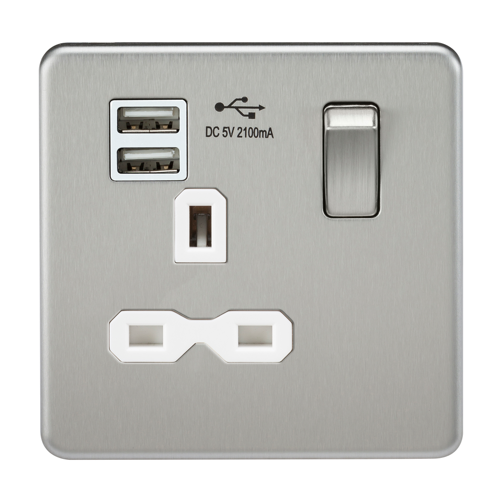 The Knightsbridge SF9901BC / SF9901BCW 13A 1G Brushed Chrome Switched Socket with Dual USB is ideal for use in the modern home, businesses and hotels. The screwless design features an easy clip-on cover with an internal gasket for moisture protection and matching screws. It has an ultra-slim profile and is constructed from durable, and high temperature resistant thermoset plastic.