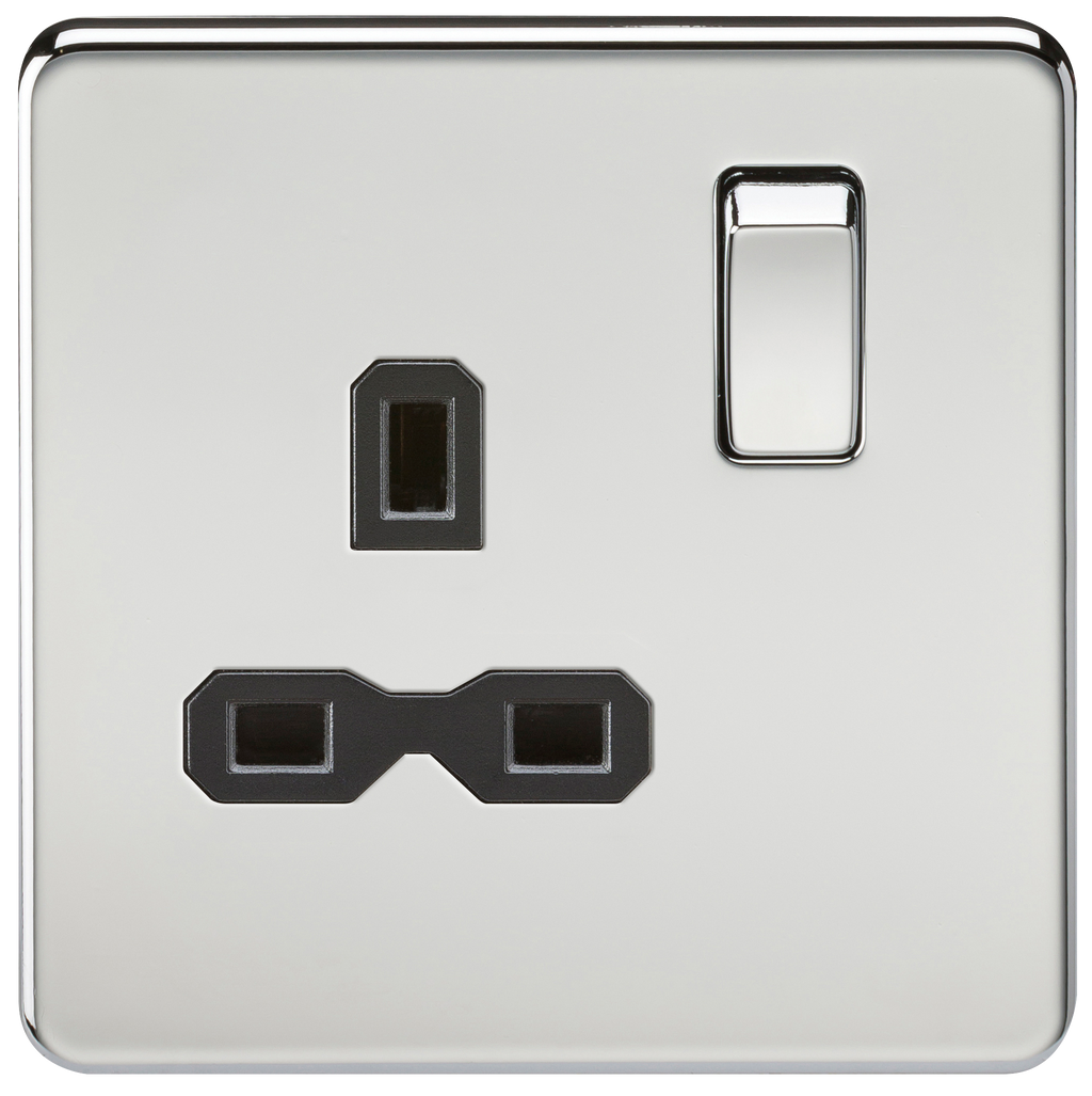 1G DP 13A Screwless Polished Chrome 230V UK 3 Pin Switched Electrical Wall Socket - Black Insert
