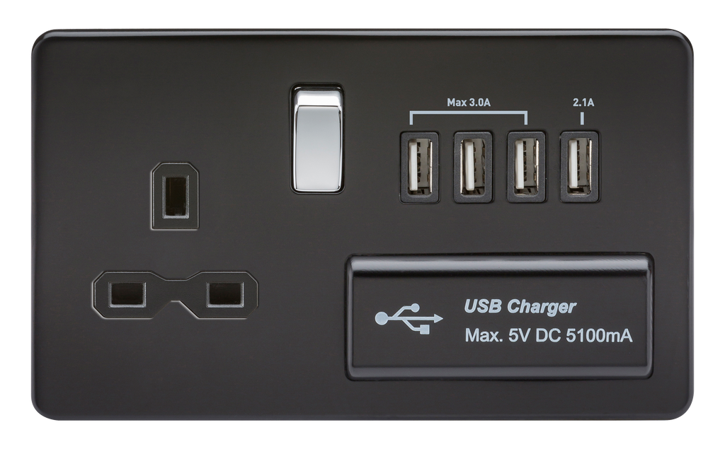 The Knightsbridge SF7USB4MB 13A 2G Matt Black Screwless Switched Socket with Quad USB is ideal for use in the modern home, businesses and hotels. The screwless design features an easy clip on cover with an internal gasket for moisture protection and matching screws. It has an ultra slim profile and is constructed from durable, and high temperature resistant thermoset plastic.