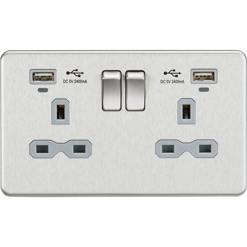 13A 2G Switched Socket, Dual USB (2.4A) with LED Charge Indicators - Brushed Chrome w/grey insert