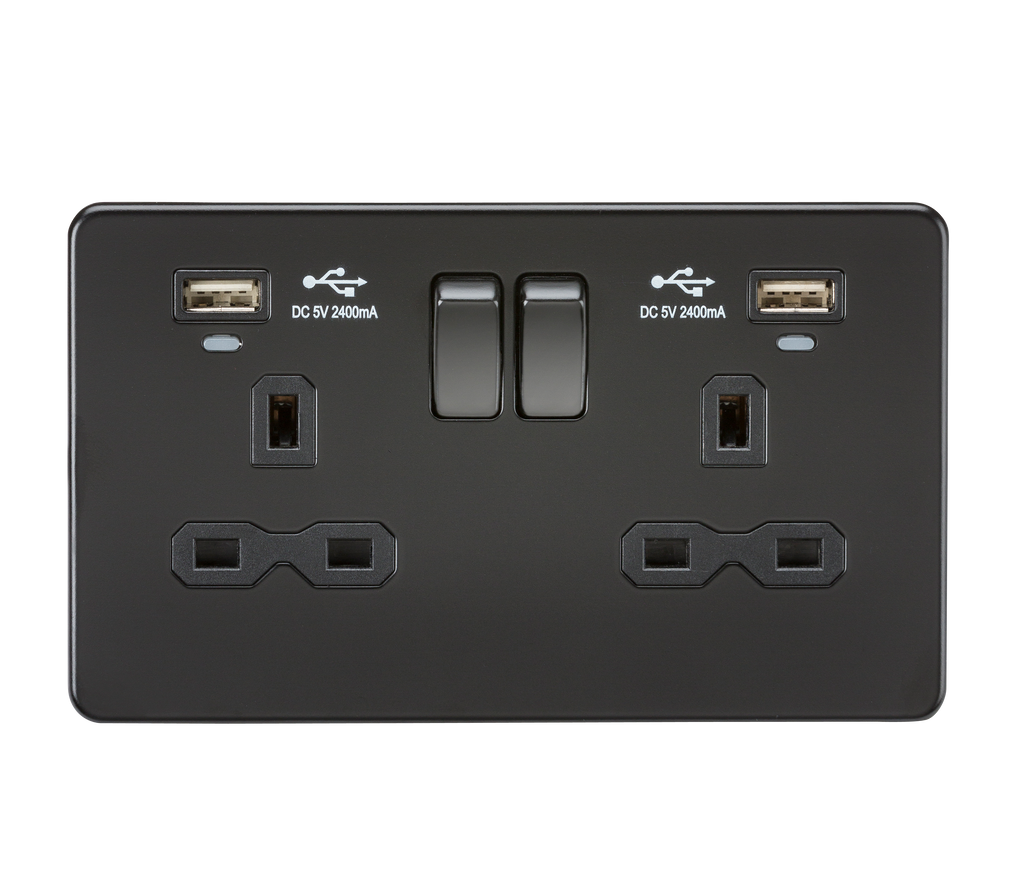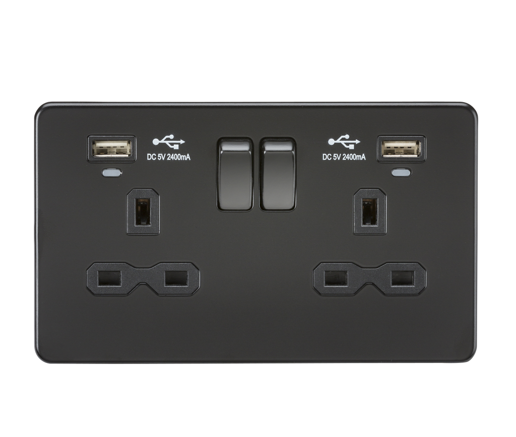 13A 2G Switched Socket, Dual USB (2.4A) with LED Charge Indicators - Matt Black