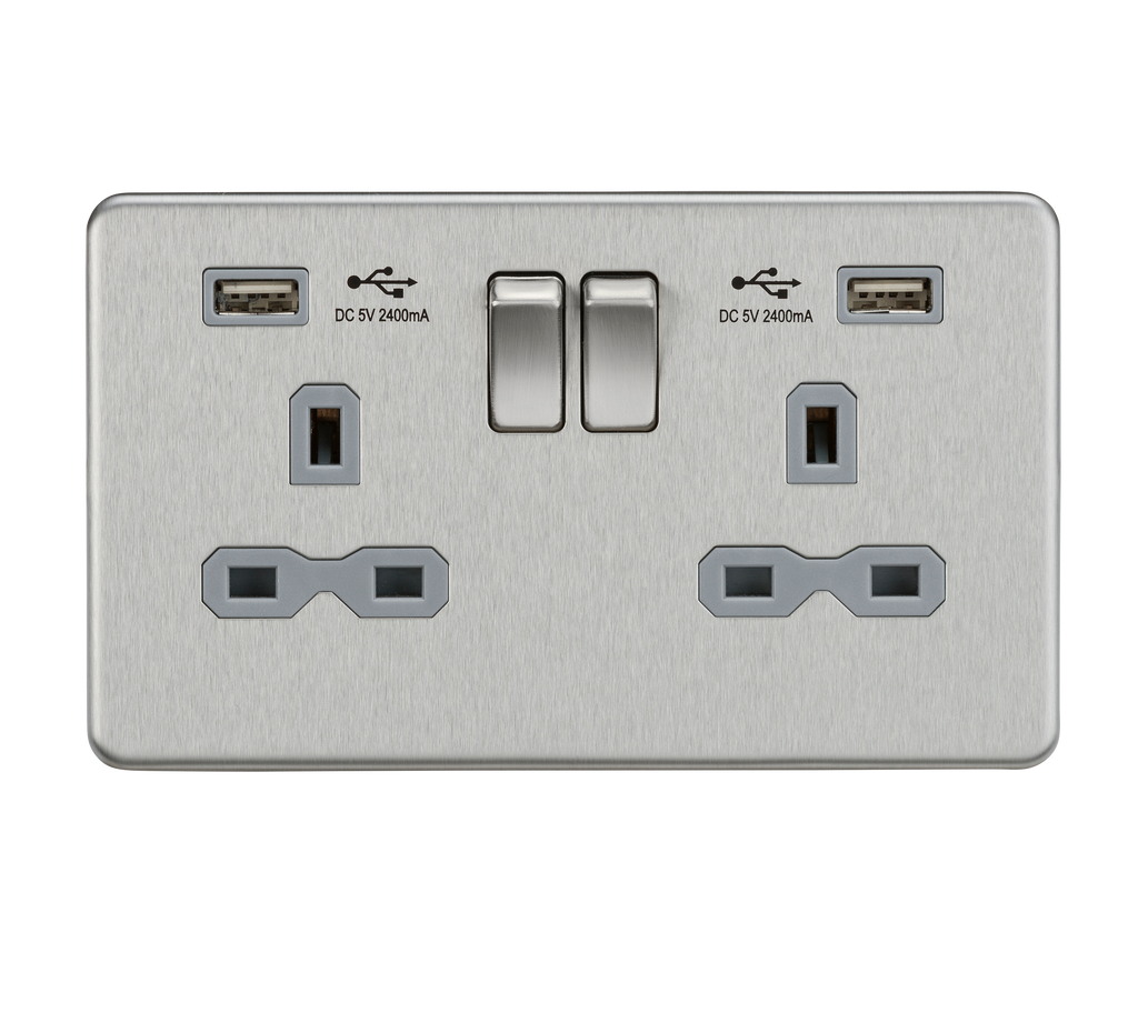 13A 2G switched socket with dual USB charger A + A (2.4A) - Brushed chrome with grey insert