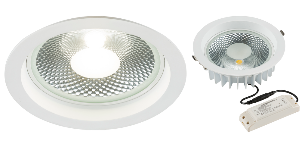 230V 30W COB LED round recessed commercial dimmable downlight. COB LED technology. High output reflector. Anti-glare fascia. Ideal for use as alternative/replacements for traditional PL downlights. Energy efficient with almost zero maintenance required. For retail, office, conference rooms, and many commercial applications. Supplied complete with plug & play constant current dimmable led driver. - Cool White, 4000K, 3480lm. Dimmable with most trailing edge dimmers (please check compatibility prior to installation).