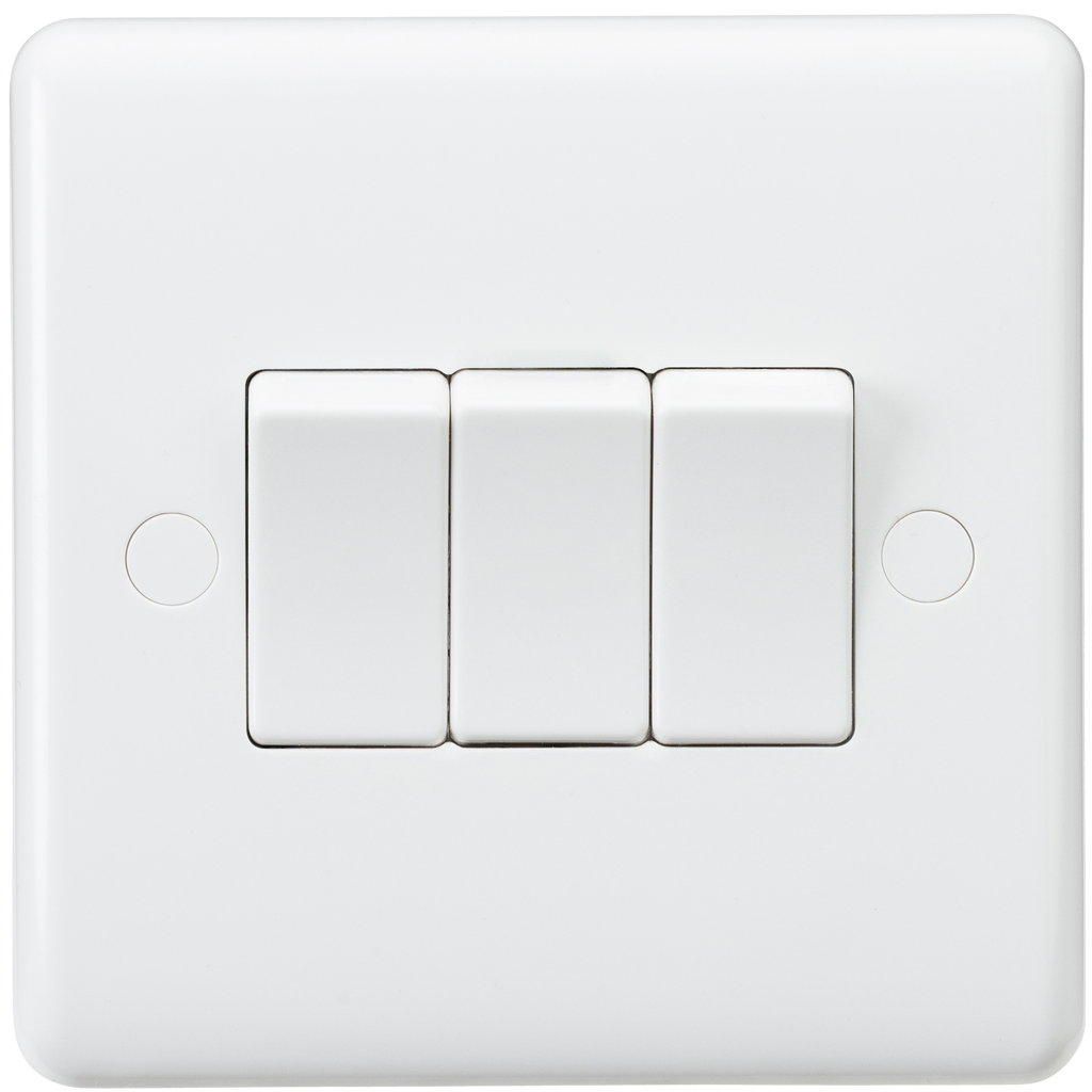 Gently contoured 7mm plate with rounded edges and anti-microbial properties - 10AX rated - 3G 2-way - Includes screw cap covers - Certified to EN 60669-1 - Supplied in Knightsbridge rip top polybag with euro slot