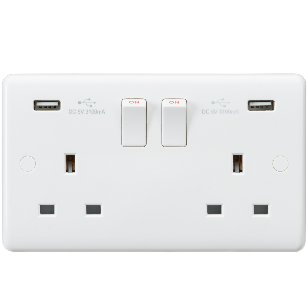 Gently contoured 7mm plate with rounded edges and anti-microbial properties, includes screw cap covers. - 13A rated - Built in Dual USB Charger 5V DC 3.1A (shared) - Top access to captive terminals to speed up installation. - Twin earths. - Min. Mounting box depth: 25-35mm dependent on wiring conditions - Certified to BS 1363-2, EN 60950-1 - Packed in Individual Knightsbridge rip top polybag with euro slot NB: Requires 35mm deep pattress box if surface mounting (CU1800) WE RECOMMEND YOU ALWAYS USE CERTIFIED USB CABLES FOR SAFETY AND TO ENSURE COMPATIBILITY