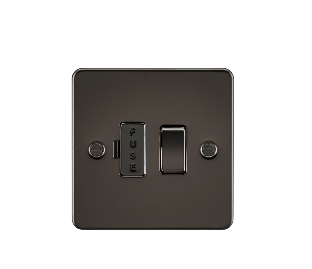 Fused spur solution in Flat Plate low profile metal design with matching fuse holder. - 13A rated - Switched - Ultra low profile design with built in gasket - Certified to BS 1363-4 - Minimum mounting box depth 25mm