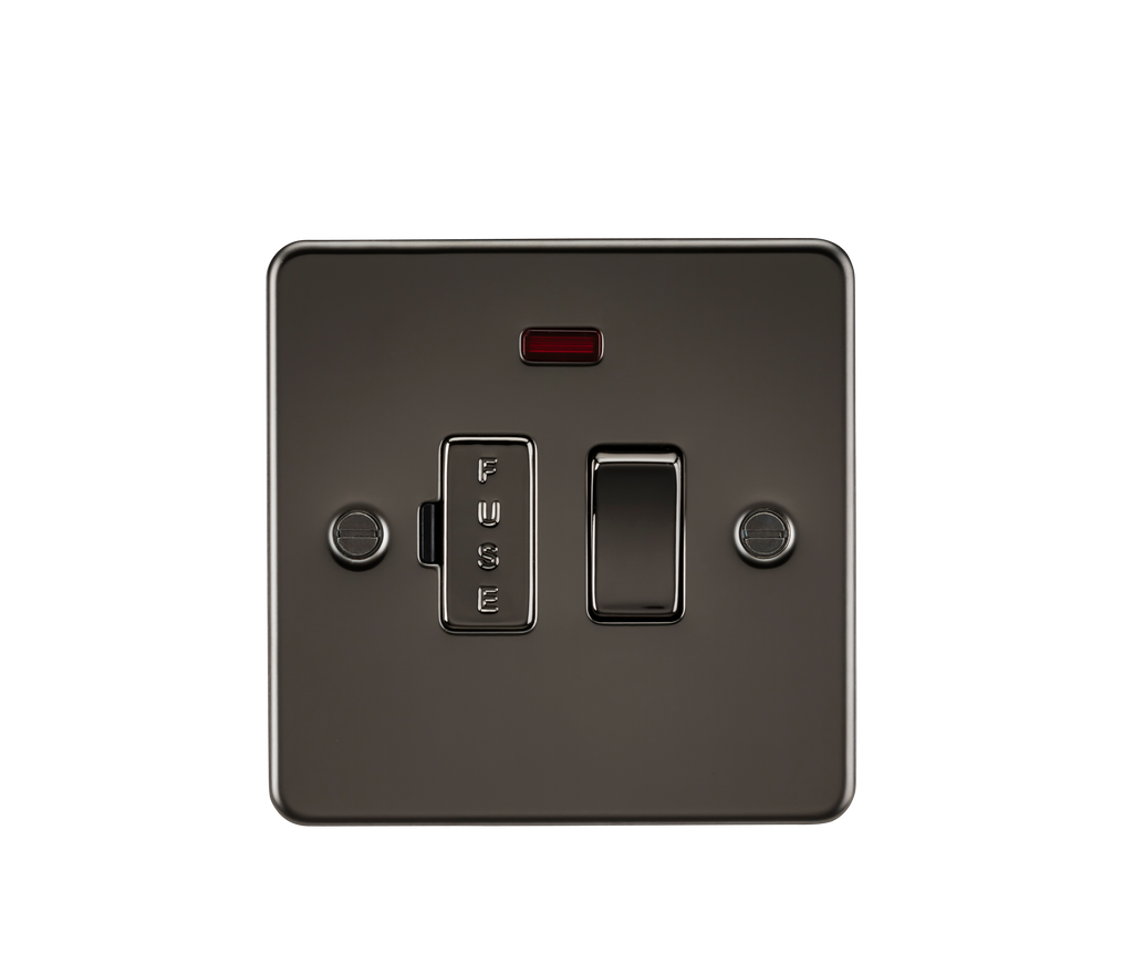 Fused spur solution in Flat Plate low profile metal design with matching fuse holder. - 13A rated - Switched - With neon indicator - Ultra low profile design with built in gasket - Certified to BS 1363-4 - Minimum mounting box depth 25mm