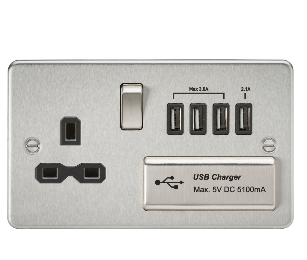 Ideal solution for multiple users, combining a 13A switched socket with a Quad USB charger. Flat Plate low profile metal design with matching metal rockers. Perfect for Coffee shops. foyers, receptions, hotel rooms etc. - 13A Switched socket - Quad USB Charging 5V DC5.1A (shared) - Dedicated 2.1A outlet for tablets - 3 outlets sharing 3A for multiple smart phones and other devices - Ultra low profile design with built in gasket - Certified to BS1363-2 - EMC Certified and ErP Ready - Minimum mounting box depth 25-35mm* *dependent on wiring conditions WE RECOMMEND YOU ALWAYS USE CERTIFIED USB CABLES FOR SAFETY AND TO ENSURE COMPATIBILITY