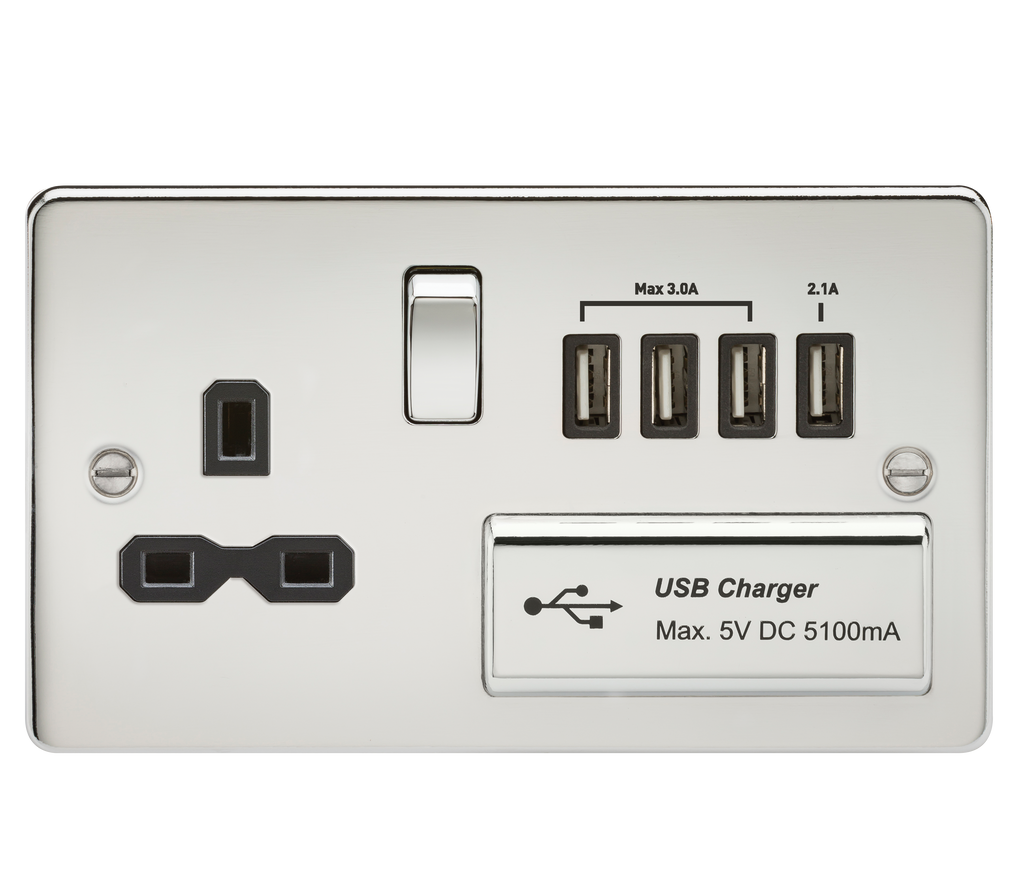 Flat plate 13A switched socket with quad USB charger - polished chrome with black insert