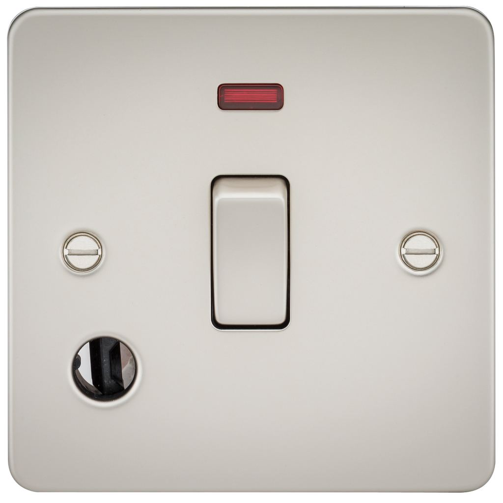 Ideal for fixed appliances such as water heaters, Flat Plate low profile metal design with matching rocker - 20A rated - Double pole - Switched - With neon indicator and flex outlet - Ultra low profile design with built in gasket - Certified to EN 60669-1 - Minimum mounting box depth 25mm