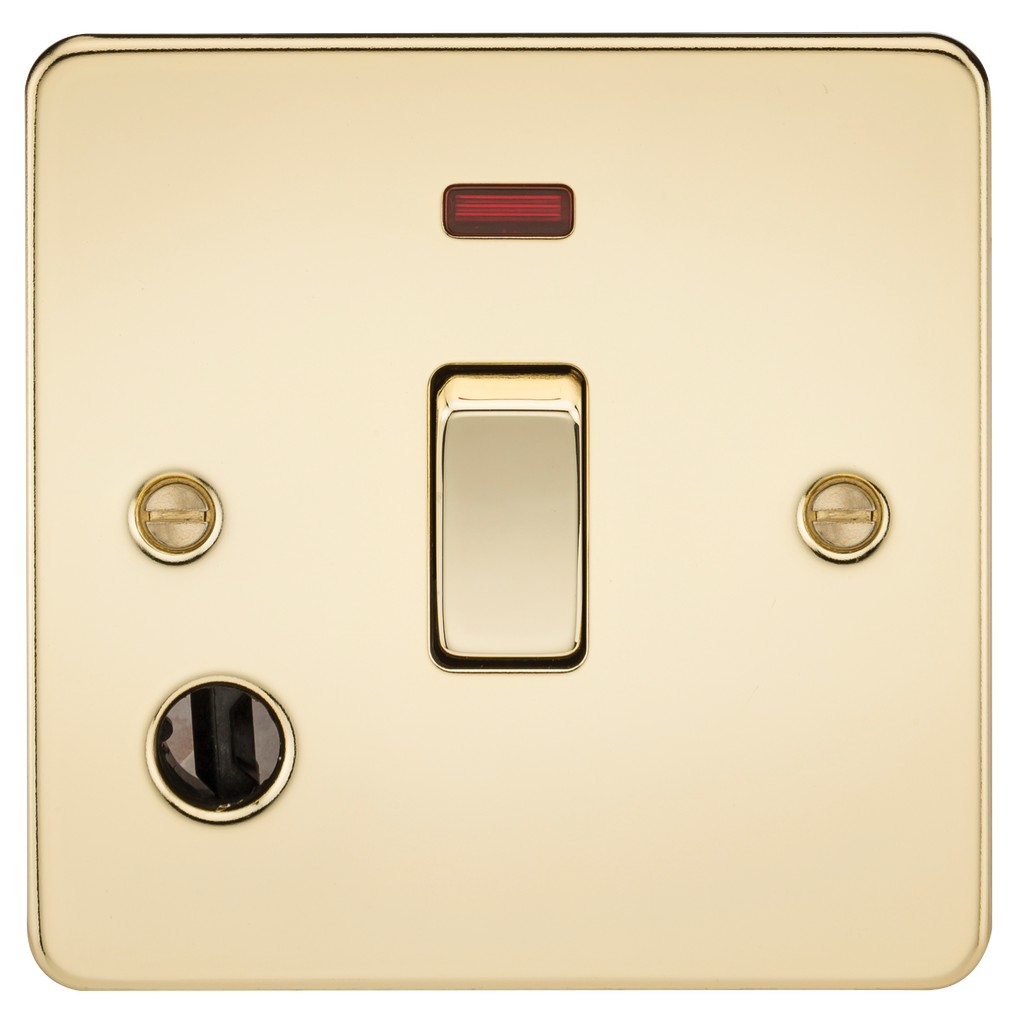 Ideal for fixed appliances such as water heaters, Flat Plate low profile metal design with matching rocker - 20A rated - Double pole - Switched - With neon indicator and flex outlet - Ultra low profile design with built in gasket - Certified to EN 60669-1 - Minimum mounting box depth 25mm