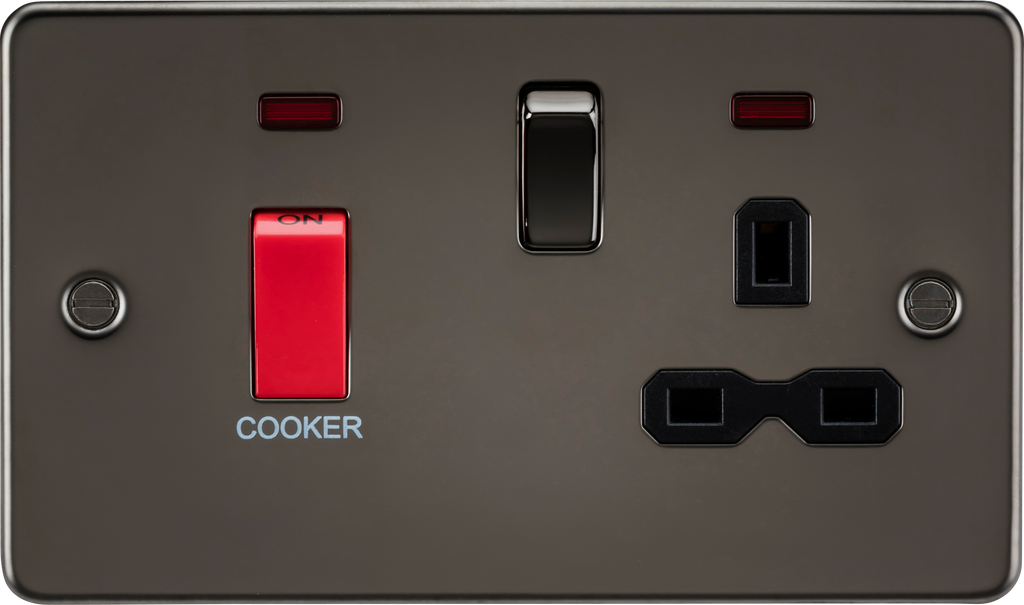 Cooker control units enable isolation of the unit so that maintenance and repairs to be carried out separately. The unit can be switched off, preventing the appliance from being turned on accidentally - for example whilst cleaning. Control two or more cooking appliances in the same room, providing rating is sufficient. This model combines a 45A switch with a 13A socket. Flat Plate low profile design. - 45A - Double pole - With neon indicators - 13A switched socket - Ultralow profile design with built in gasket - Certified to BS 4177, BS 1363-2 - Minimum mounting box depth: 47mm