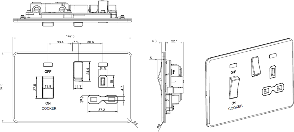 Cooker control units enable isolation of the unit so that maintenance and repairs to be carried out separately. The unit can be switched off, preventing the appliance from being turned on accidentally - for example whilst cleaning. Control two or more cooking appliances in the same room, providing rating is sufficient. This model combines a 45A switch with a 13A socket. Flawless Screwless design. - 45A - Double pole - With neon indicators - 13A switched socket - Screwless low profile design with built in gasket - Certified to BS 4177, BS 1363-2 - Minimum mounting box depth: 47mm