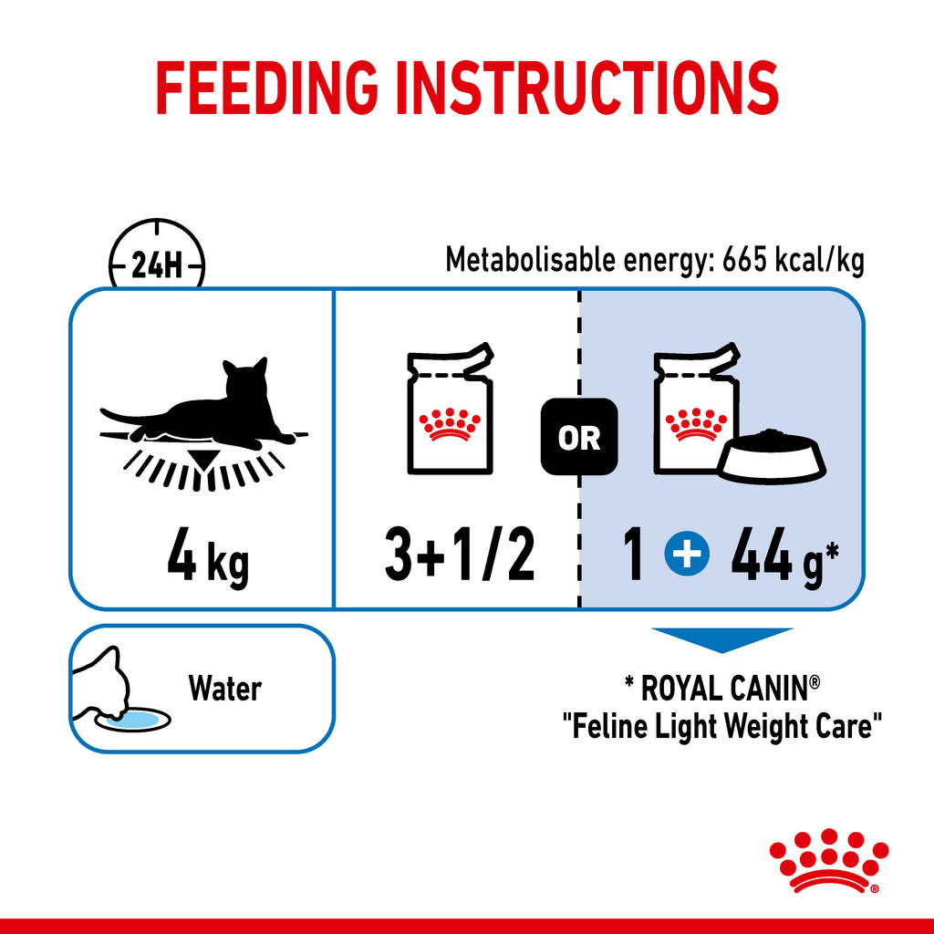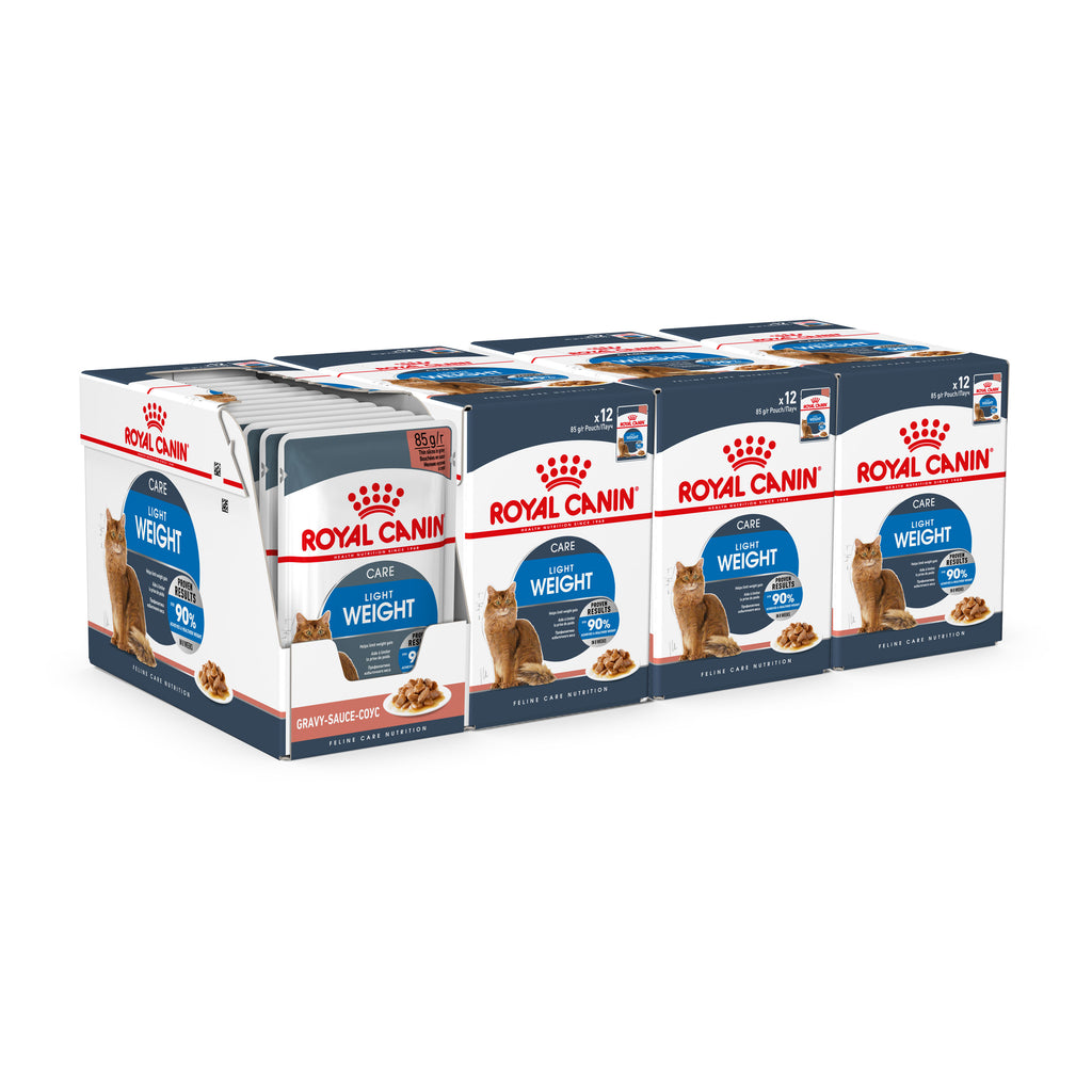 Weight Care is a precisely balanced nutritional formula which helps maintain a healthy body condition.If your cat is showing signs of being overweight, it can be difficult to help it lose excess weight if it’s used to its mealtime schedules. However, you don’t have to reduce its food intake to help manage your cat’s weight, as long as what you feed it is tailored to its specific requirements. ROYAL CANIN® Light Weight Care in Gravy helps reduce the calorie intake of cats to help limit weight gain and maintain a healthy weight bracket. The nutrients are also enriched with L-Carnitine, to help support and stimulate a healthy and fast-acting metabolism. When consuming a type of food to maintain a healthy weight, your cat’s diet will play a big part in the maintenance of muscle mass and keeping fat levels at an optimum level. ROYAL CANIN® Light Weight Care in Gravy contains a high protein content to contribute to muscle mass, without compromising the calorie reduction needed to limit weight gain – resulting in a leaner, healthier body type for your cat. Additionally, the nutrients in this product support a healthy urinary system for healthy bladder function maintenance. Follow ROYAL CANIN® Light Weight Care’s product instructions to yield the best results and make a difference to your cat’s body weight and nutritional health. To cater to each cat’s individual preferences, ROYAL CANIN® Light Weight Care is also available as dry food, with crunchy and tasty kibble. If you’re considering mixed feeding, simply follow our feeding guidelines to ensure your cat gets an accurate amount of both wet and dry food for optimal benefit. At Royal Canin we’re committed to providing nutritional solutions to your pet’s needs. All of our products undergo an extensive quality control process in order to guarantee the optimum quality of food as well as catering to your cat’s specific dietary requirements and lifestyle. This means that when your cat eats ROYAL CANIN® Light Weight Care in Gravy, it’s getting a complete and balanced diet.