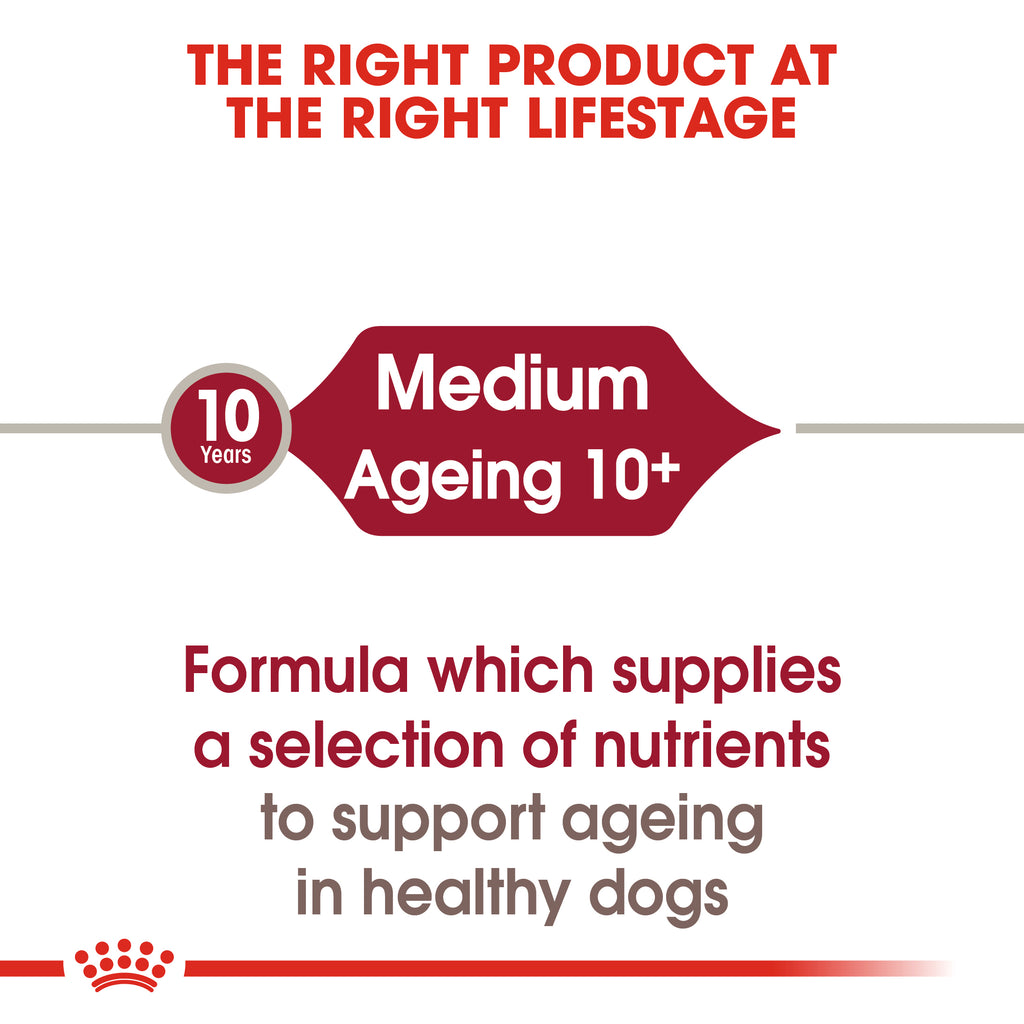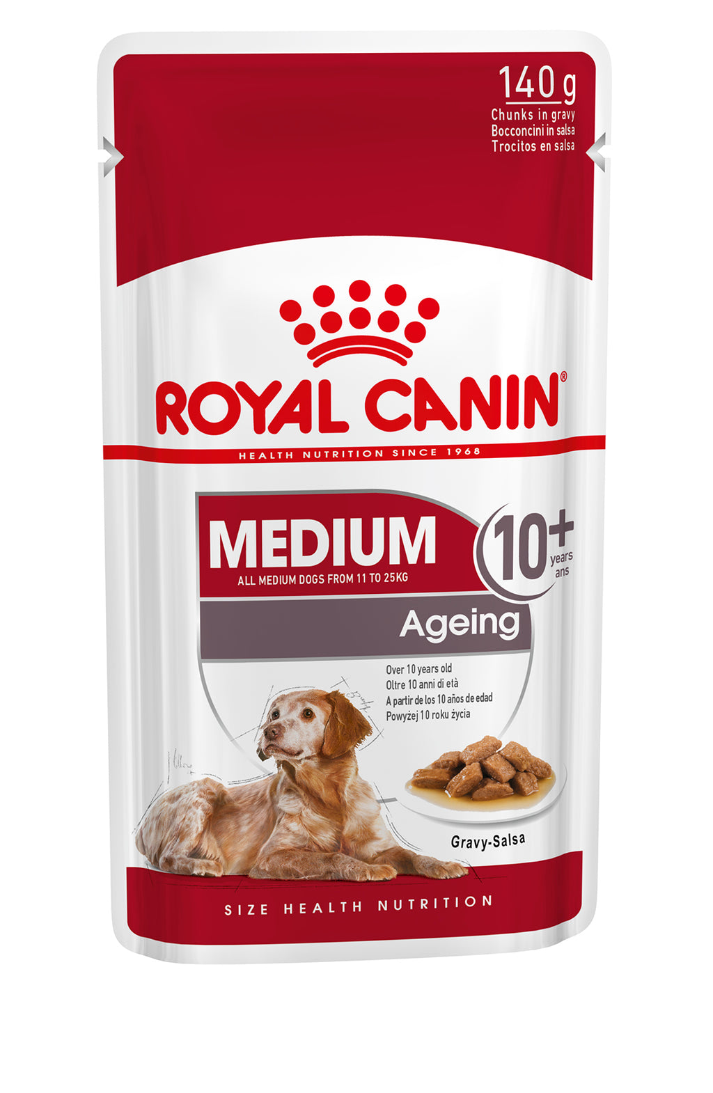 Formulated with specific nutrients for a shiny coat and healthy skin.Now that your medium sized dog is starting to face the first signs of ageing, it is important that its diet contains the nutrients it needs in order to help support optimal health during this stage of its life. Suitable for medium sized dogs over 10 years old that weigh between 11-25 kg, ROYAL CANIN® Medium Ageing 10+ in Gravy is specially formulated with all the nutritional needs of dogs like yours in mind. ROYAL CANIN® Medium Ageing 10+ in Gravy contains an exclusive complex of antioxidants; these antioxidants help to neutralise the effects of free radicals to support optimal health during your dog’s senior years. EPA and DHA are Omega-3 fatty acids that are included in ROYAL CANIN® Medium Ageing 10+ in Gravy to help maintain healthy joints and bones in medium breed dogs like yours that are ageing. What’s more, ROYAL CANIN® Medium Ageing 10+ in Gravy is formulated with specific nutrients that help to maintain a shiny coat and healthy skin. As your dog ages, it is important to continue supporting its skin and coat health to ensure it remains in the best possible condition. To cater to each dog’s individual preferences, ROYAL CANIN® Medium Ageing 10+ is also available as dry food, with crunchy and tasty kibble. If you’re considering mixed feeding, simply follow our feeding guidelines to ensure your dog gets an accurate amount of both wet and dry food for optimal benefit. At ROYAL CANIN® we’re committed to providing nutritional solutions to your pet’s needs. All of our products undergo an extensive quality control process in order to guarantee the optimum quality of food as well as catering to your dog’s specific dietary requirements and lifestyle. This means that when your dog eats ROYAL CANIN® Medium Ageing 10+ in Gravy, it’s getting a complete and balanced diet.