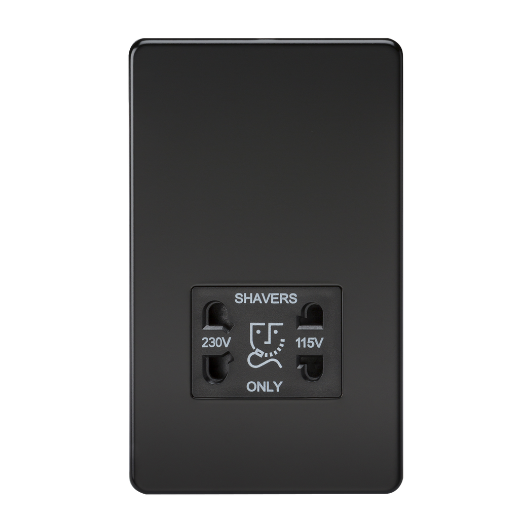 The Knightsbridge SF8900MB Matt Black Shaver Socket is the ideal decorative upgrade for use in the modern home, businesses and hotels. The screwless design features an easy clip on cover with an internal gasket for moisture protection and matching screws. It has an ultra slim profile and is constructed from durable, and high temperature resistant thermoset plastic.